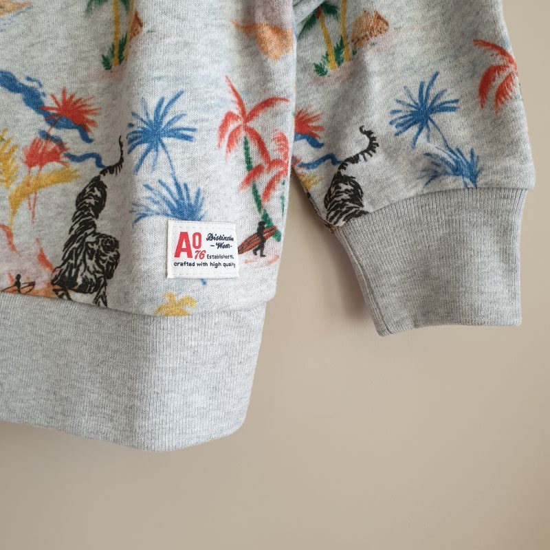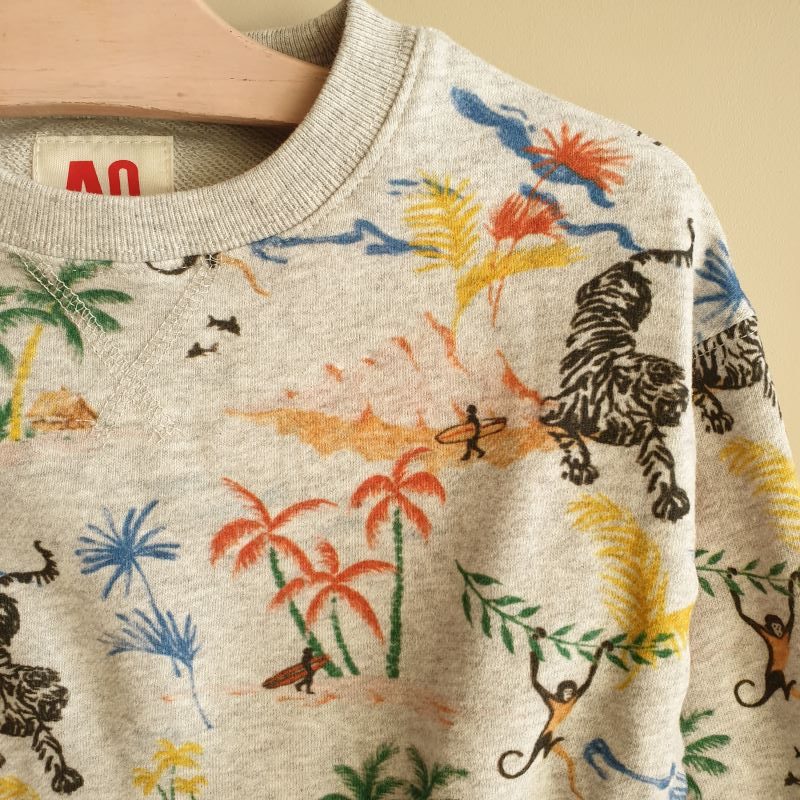 Superbe sweat en coton gris chiné, fantaisie jungle multicolore . Encolure ronde . Taille normalement . AO76, est une marque Belge de vêtements pour enfants .