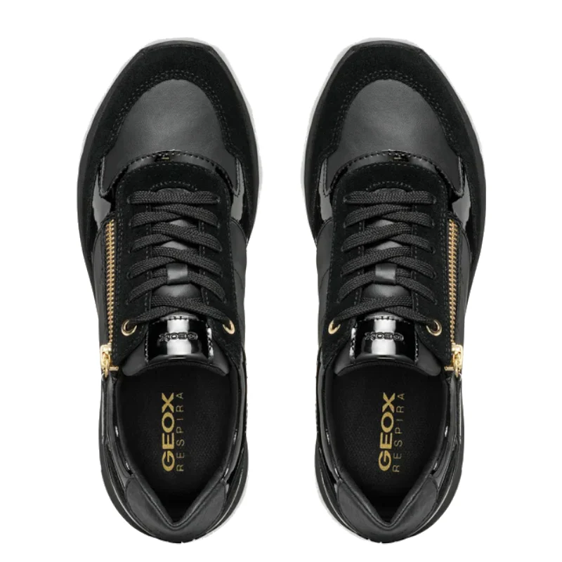 Les sneakers Desya de Geox, en couleur noir, allient style sportif et raffinement, avec une fermeture éclair latérale pour un enfilage facile et rapide. Conçues dans un mélange élégant de cuir nappa souple et de cuir velours, ces chaussures sont essentielles pour un look ton sur ton. Leur design s’inspire des chaussures de running, revisité dans un style moderne et tendance qui apporte du caractère aux tenues décontractées chic, idéales pour les moments de loisirs. Les Desya sont équipées d’une fermeture à lacets complémentaire et d’une semelle intérieure amovible pour un confort ajustable.