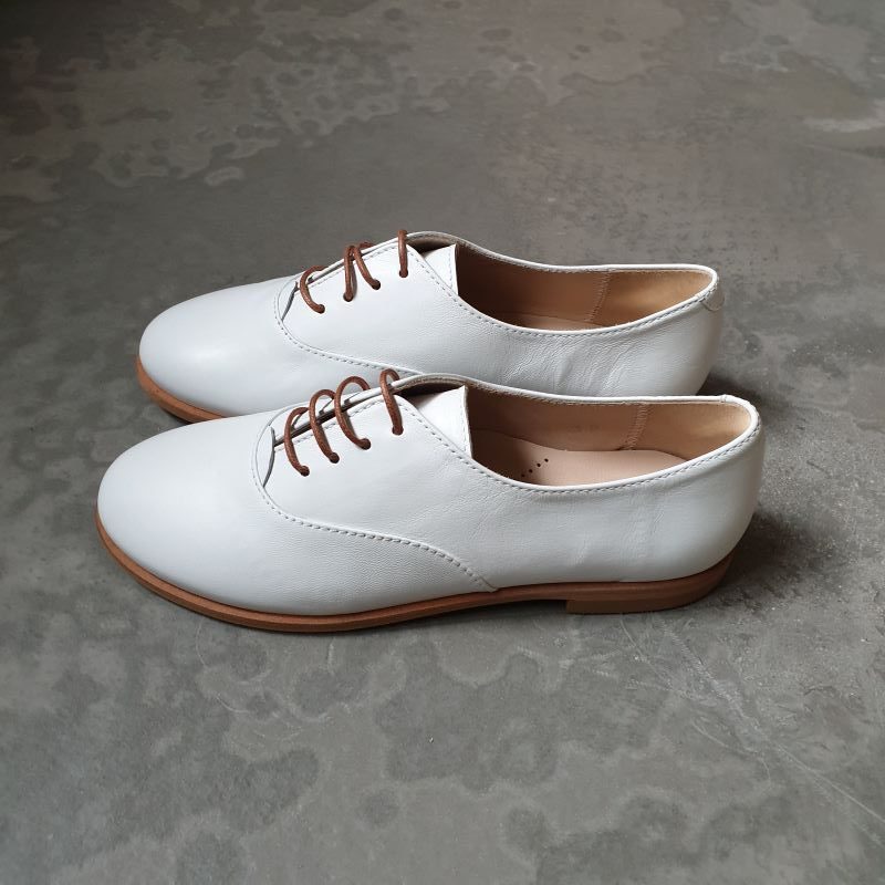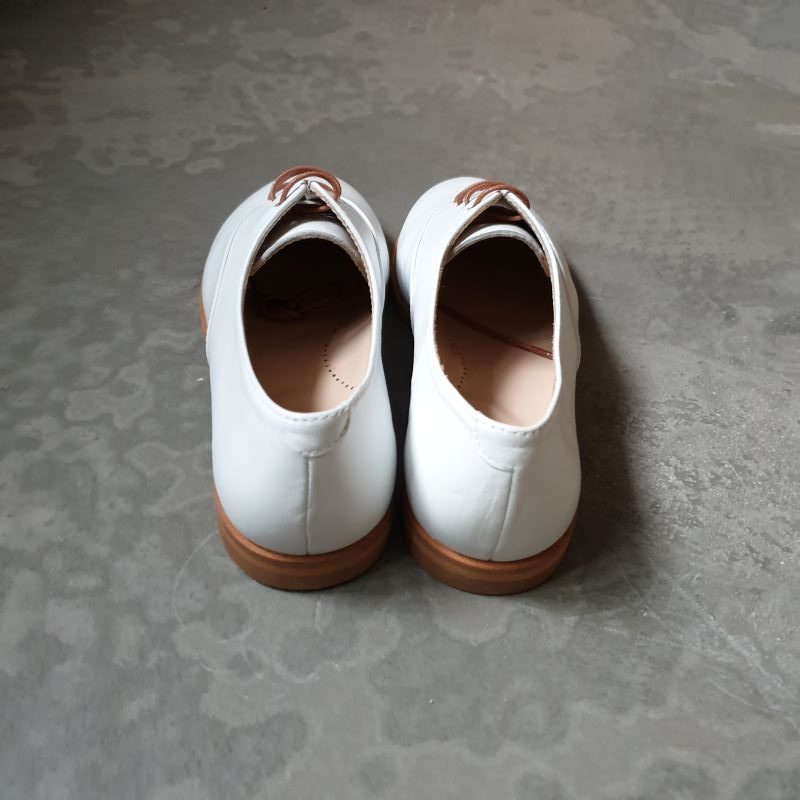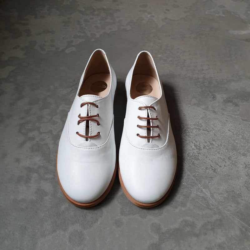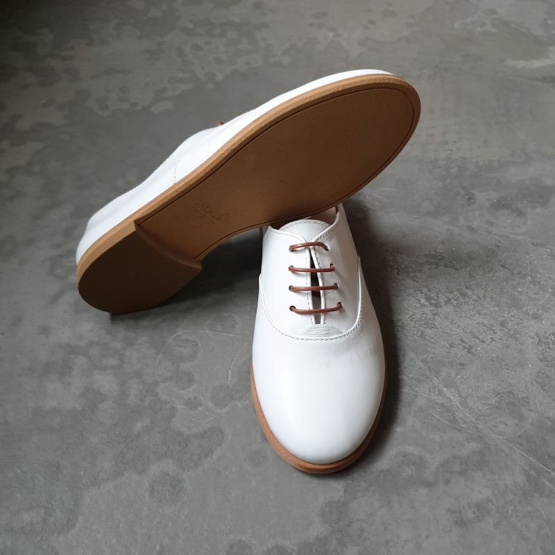 Superbe chaussure type derby tout en cuir , coloris blanc chic. Cuir tres souple et léger. Peu se porter pied nu . Ce modéle conviendra particulièrement bien aux pieds fins.