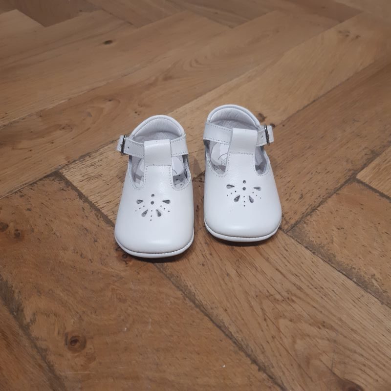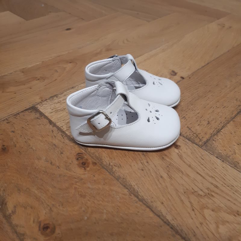 Jolie chaussure layette mixte et intemporel . Grace à sa boucle réglable , ce produit tiens bien au pied. Coloris blanc  très facile à assortir.