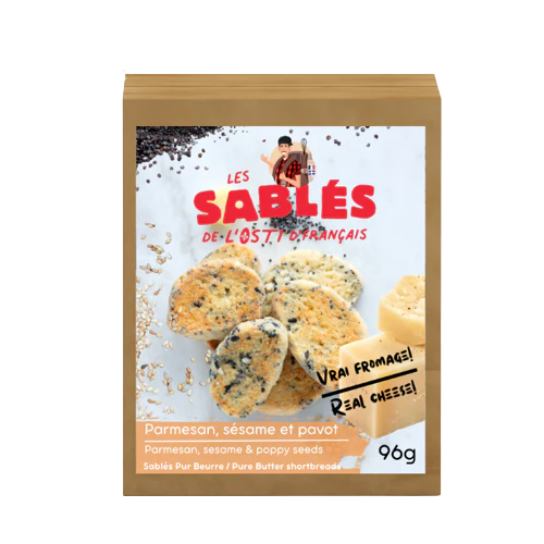 Ingrédients : Farine de blé blanche non blanchie, beurre salé, oeufs entiers, parmesan, graines de sésame, graines de pavot, sel, sucre, baking soda. Contient : Blé, oeuf, sésame. Peut contenir : Noix et arachides, sulfites, soja, lait.