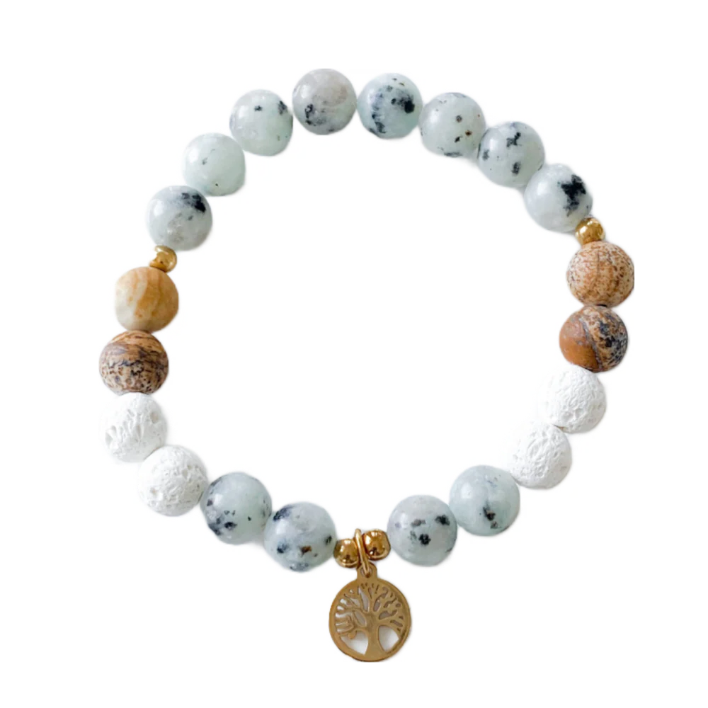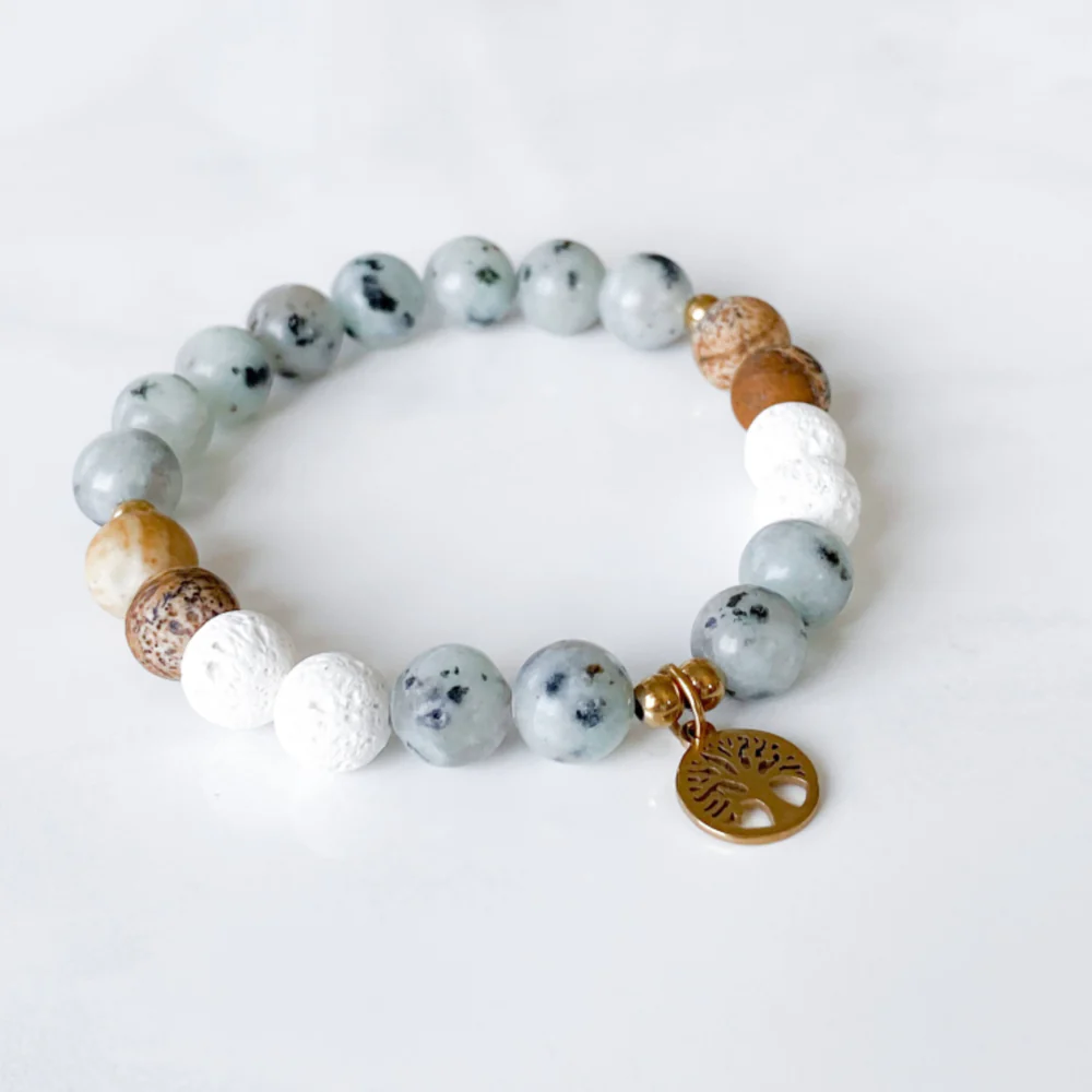 Il est composé de pierres semi-précieuses de Jaspe kiwi, Jaspe paysage et pierres de lave blanche, toutes choisies pour leur propriétés apaisantes et bénéfiques pour le bien-être.