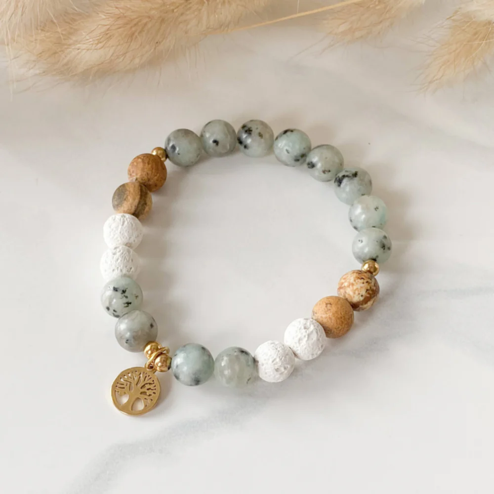 Informations supplémentaires : Le Jaspe kiwi vous apportera sérénité et t’aidera à trouver la paix intérieure, tandis que le Jaspe paysage vous offrira un sentiment de stabilité et de soutien. Les pierres de lave quant à elles sont des diffuseurs d’huiles essentielles naturels, pour une relaxation supplémentaire en inhalant les senteurs de vos huiles préférées. La breloque en forme d’arbre de vie apporte une symbolique inspirante à votre poignet. L’arbre de vie représente la croissance, la force, la stabilité, l’unité et la sagesse, renforçant ainsi votre amour envers vous-mêmes et votre confiance en soi.