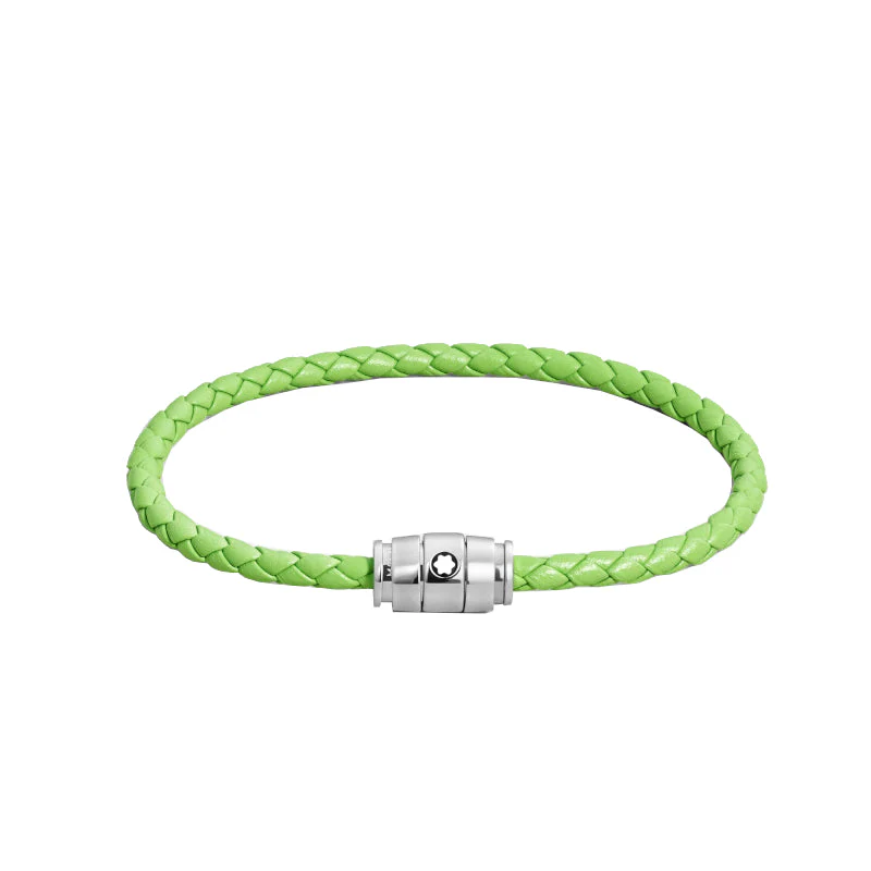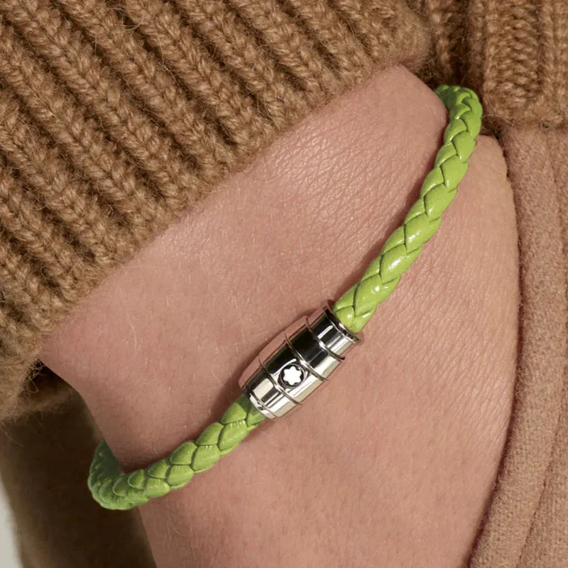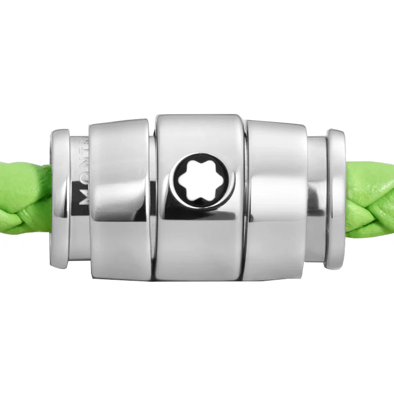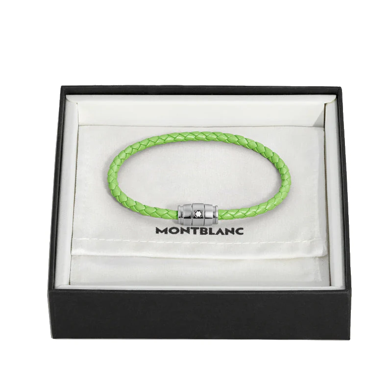 Ce bijou, tissé à partir de cuir vert citron, est doté d’une boucle en acier inoxydable poli rehaussée de l’emblème Montblanc.