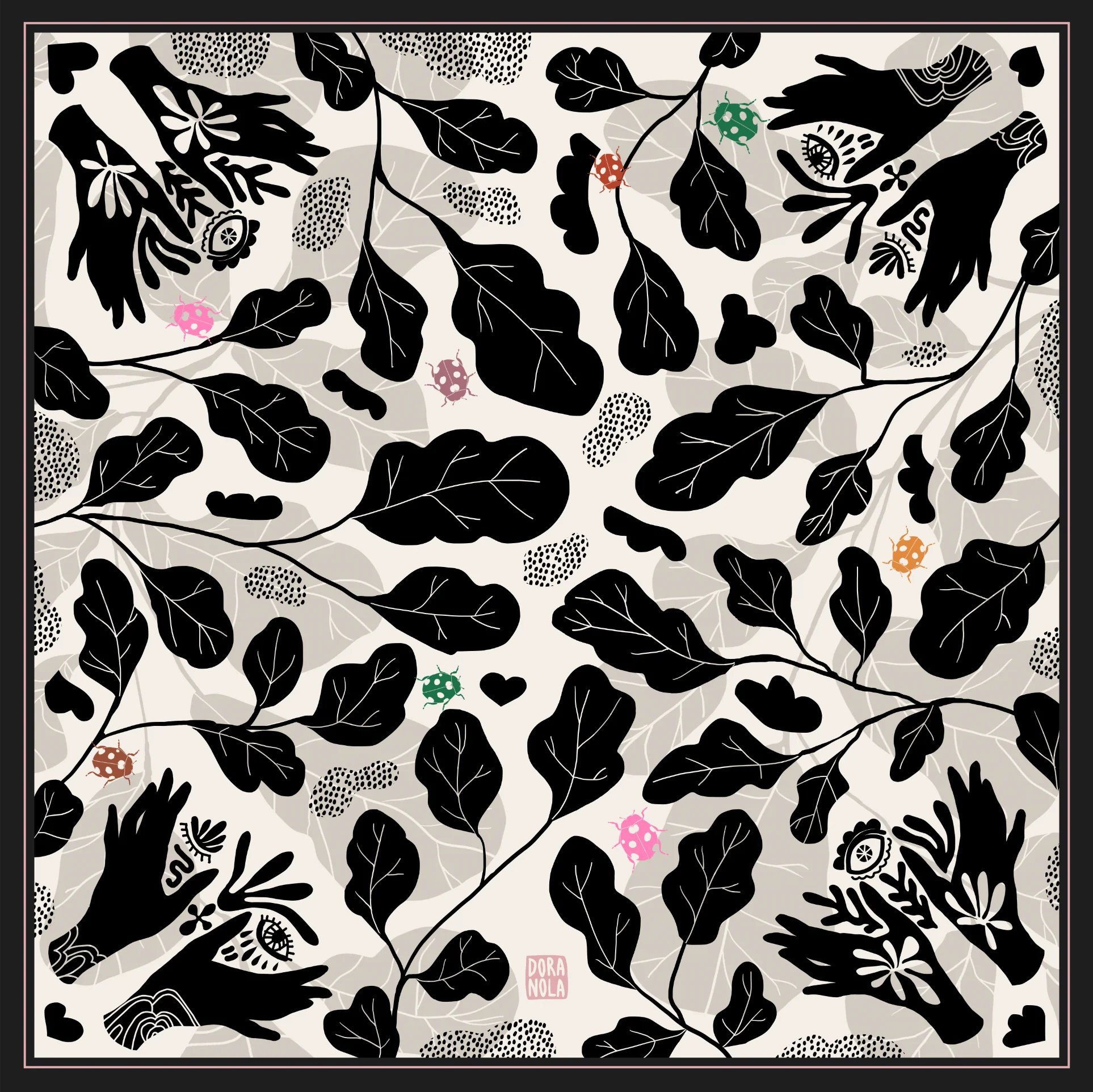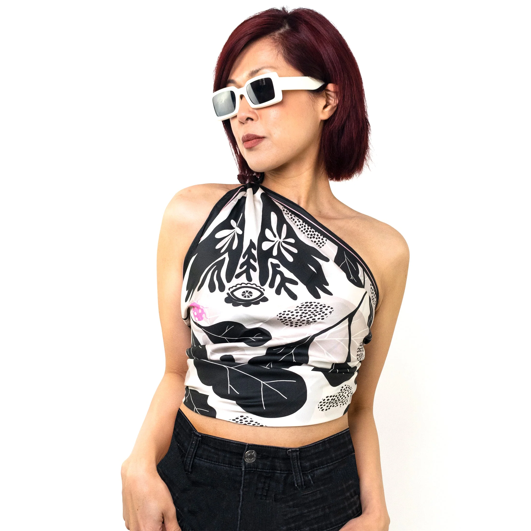 Un délice en noir et blanc ! Un peu sorcier, un peu mystérieux, ce motif se pare de mains symboliques et d’yeux qui voient tout. Porté autour du cou ou dans les cheveux, ce foulard 100% soie ajoutera un élément graphique pointu à votre tenue. Vous pouvez également le porter en haut ou en robe !