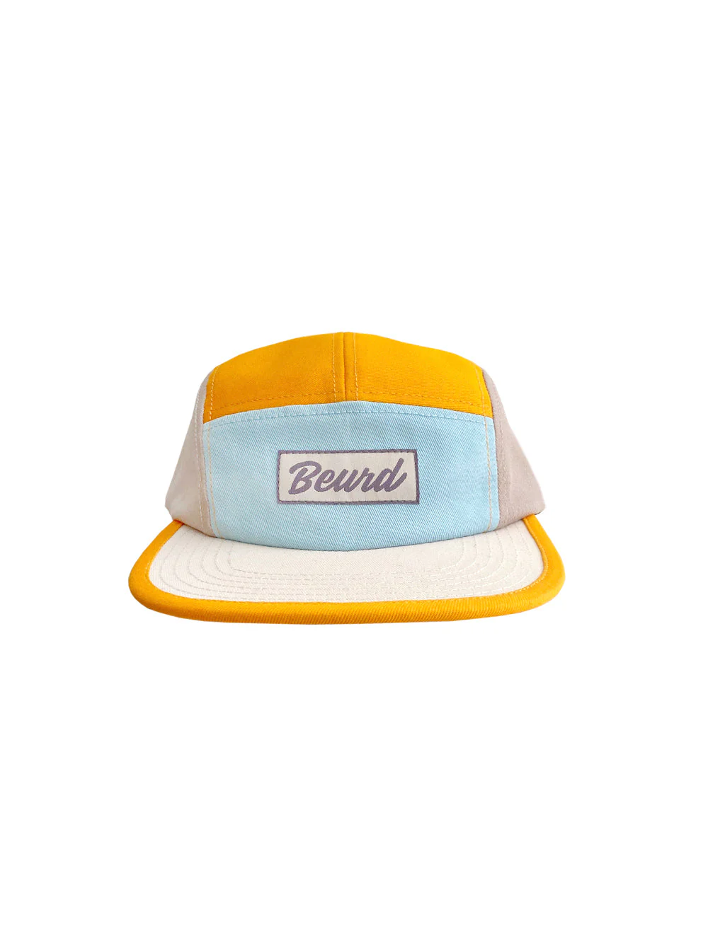 . Casquette camper beige, bleu et orange 5 panneaux.
