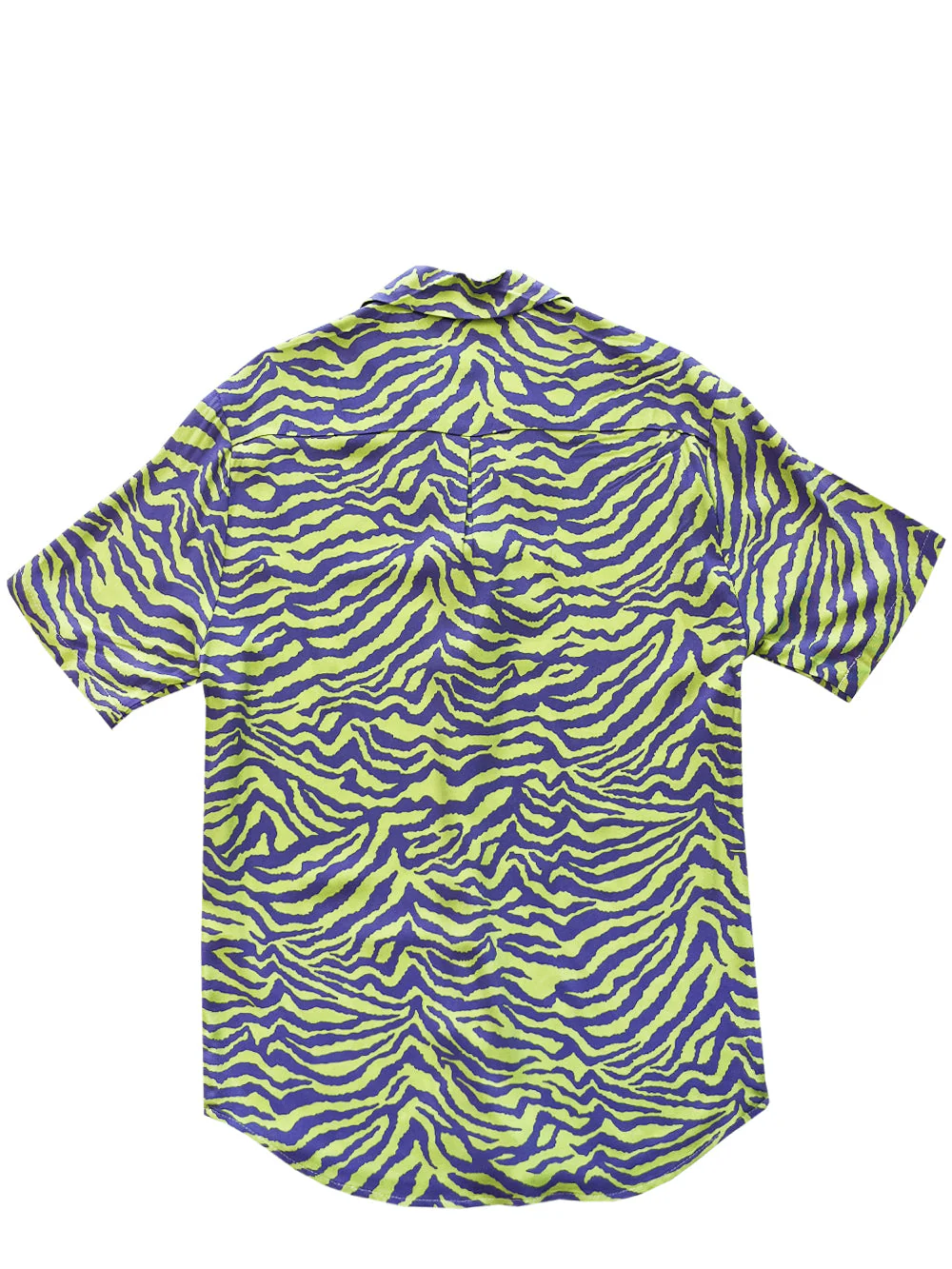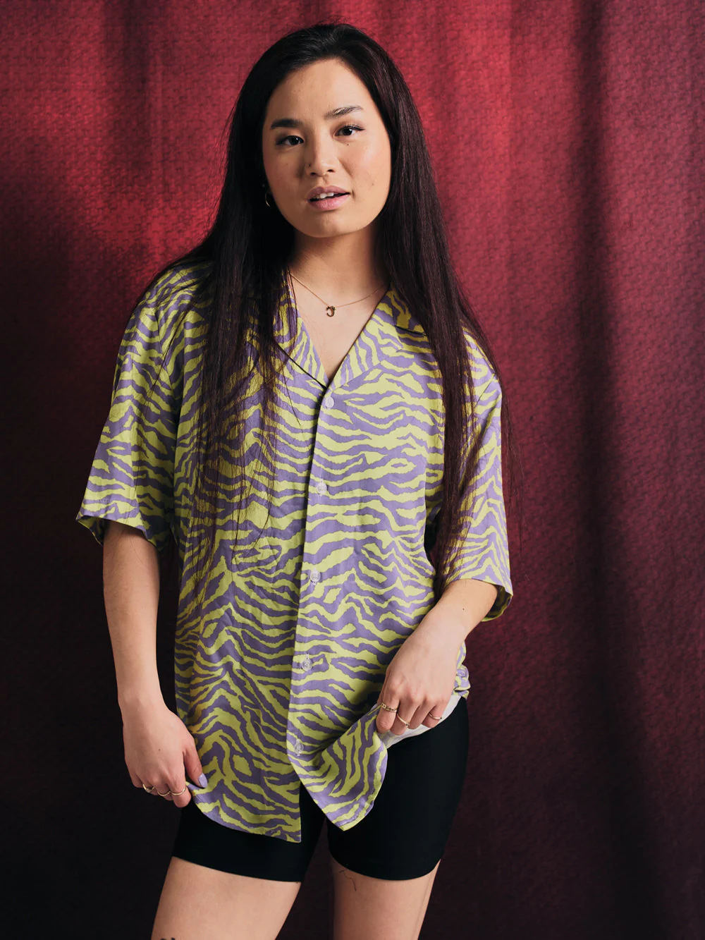 . Chemise unisexe avec imprimé all over vert et mauve.