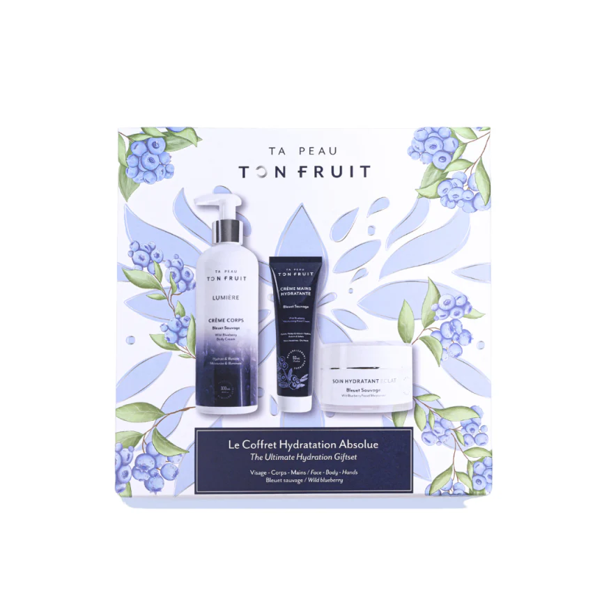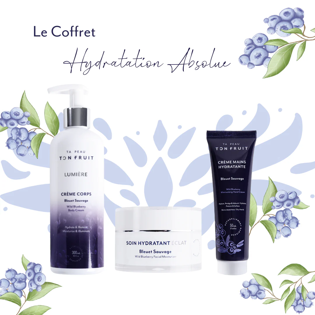 Le Coffret Hydratation Absolue renferme tous nos essentiels Visage-Corps-Mains pour une peau parfaitement hydratée de la tête aux pieds! Ce trio de produits aux bleuets sauvages permettent de maintenir une peau nourrie, hydratée et lumineuse!