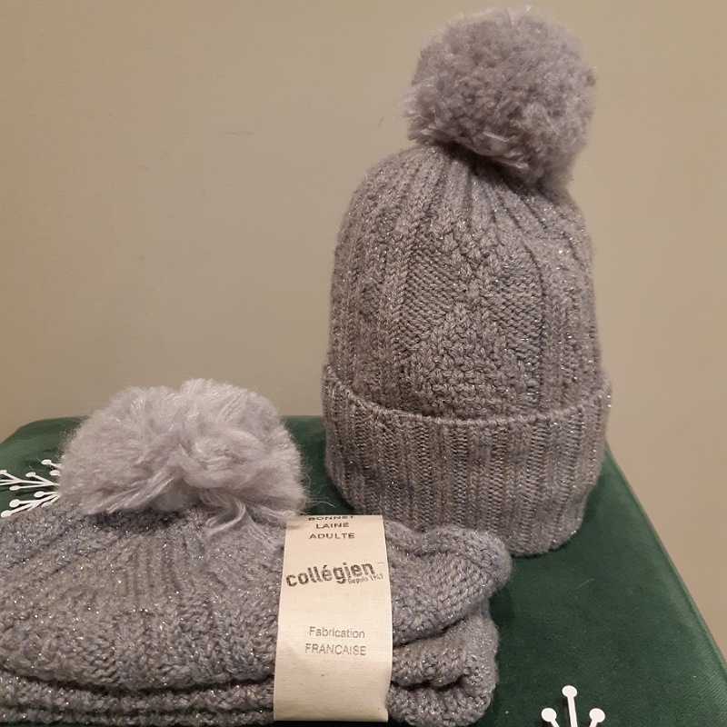 Jolie bonnet en laine et lurex de chez collegien. Maille douce et chaude pour ce modéle coloris gris clair Produit fabriqué en France .
