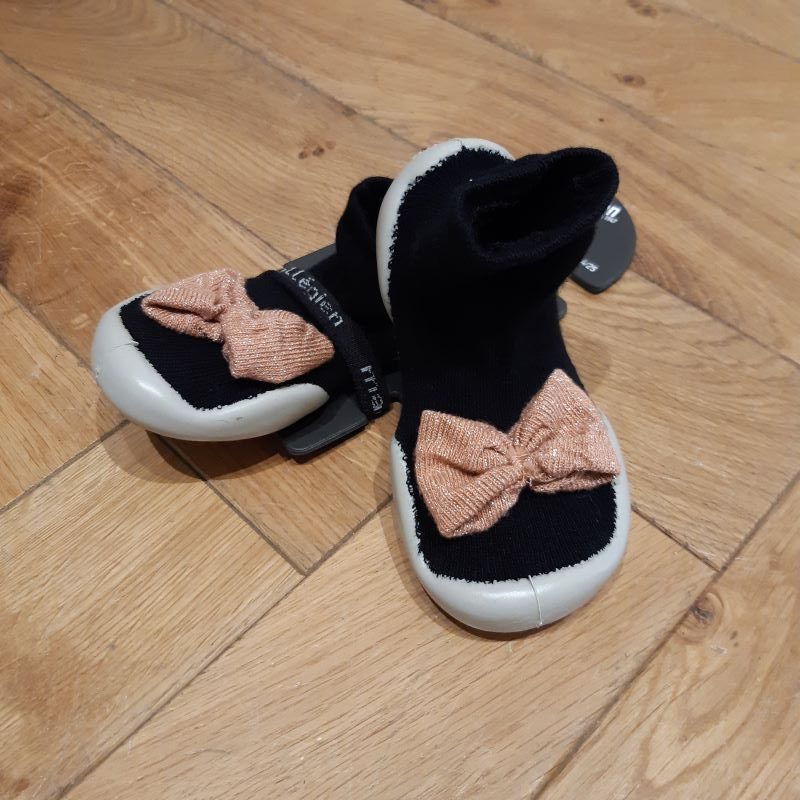 Chaussons chaussette idéal pour le quotidien de vos enfants . Peuvent être aussi utilisés à l’école. Souple, léger et lavable en machine , ces chaussons sont fabriqués en France. Coloris noir et nœud rose nude pailleté Attention taille petit . ex : Les 28/29 conviennent à un 27