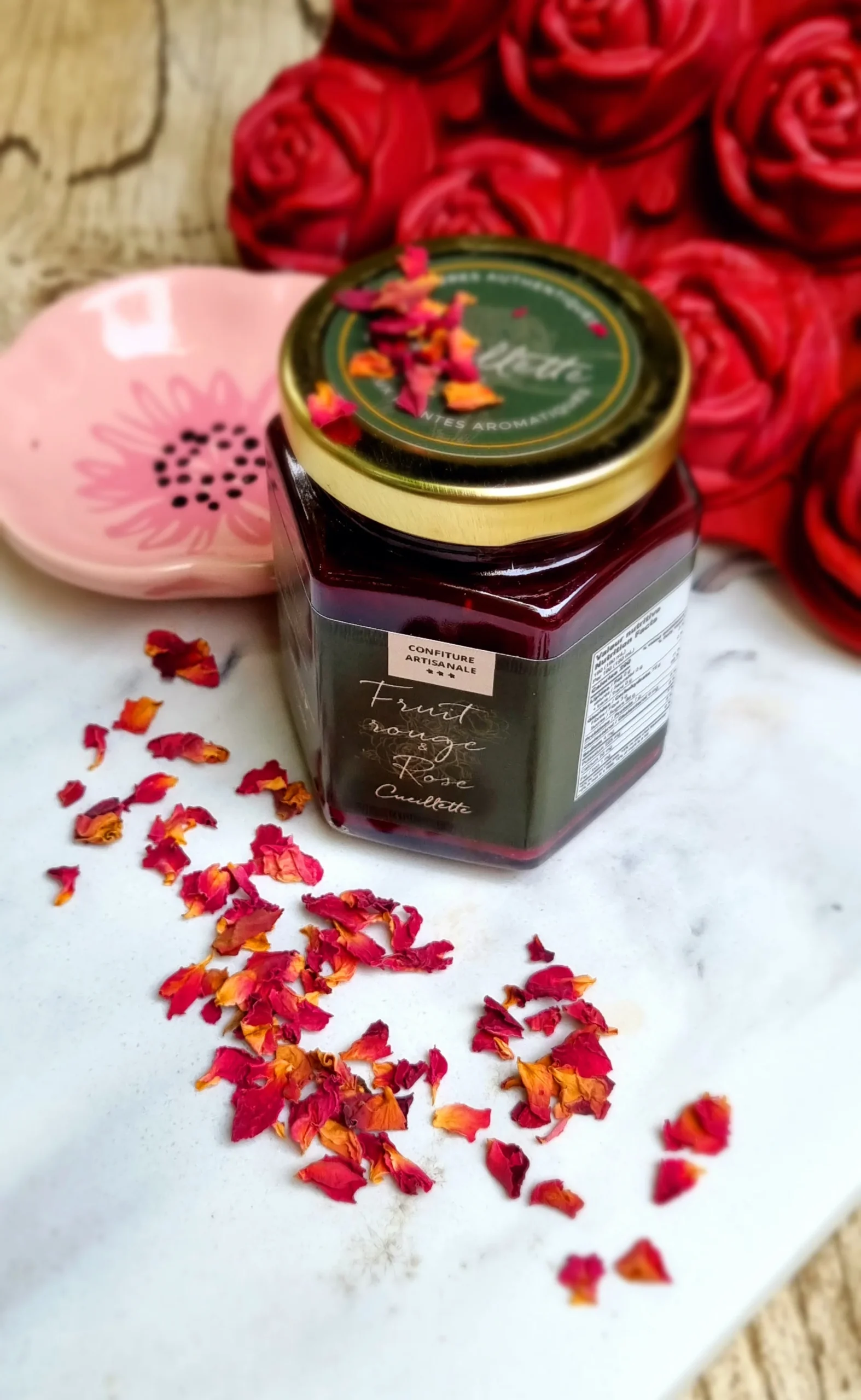 Ingrédients : fruits rouges, sucre blanc, pétales de rose, jus et zeste de citron