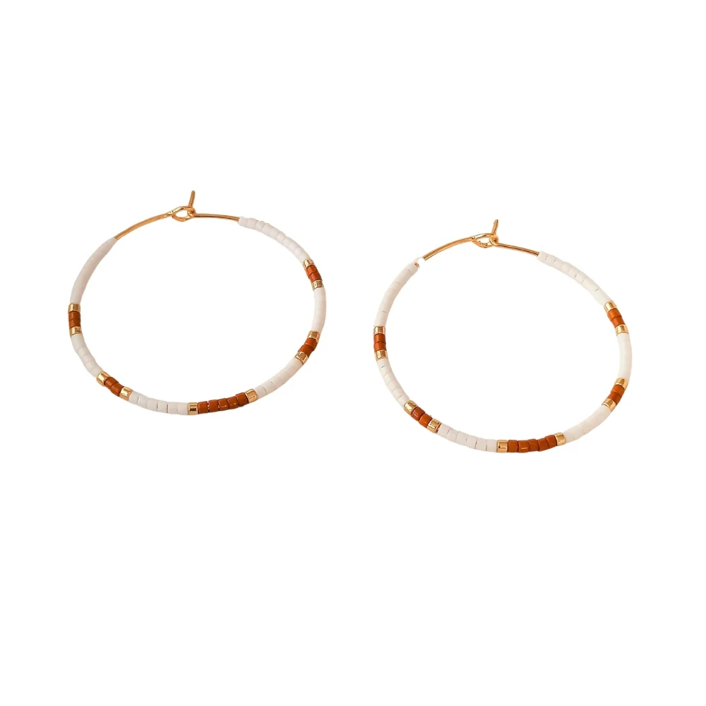 Créoles raffinées composées de perles de verre Miyuki® dorées, blanches et camel.
