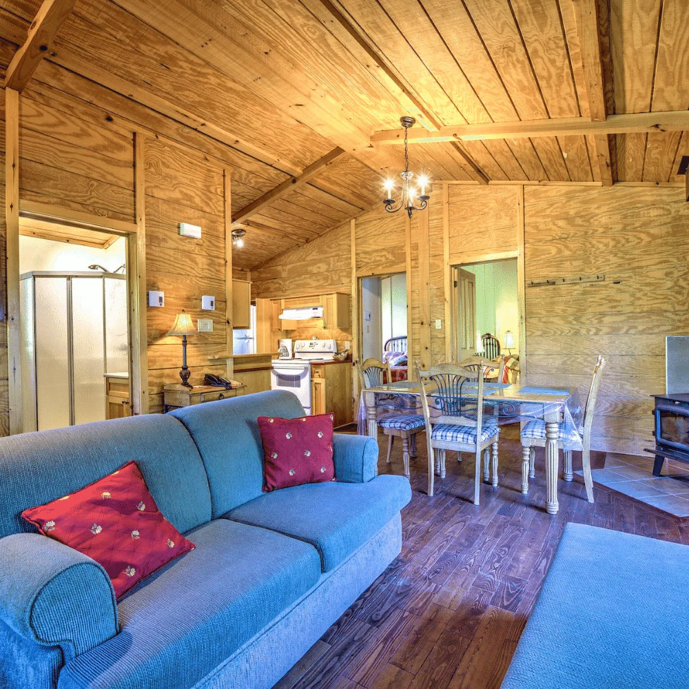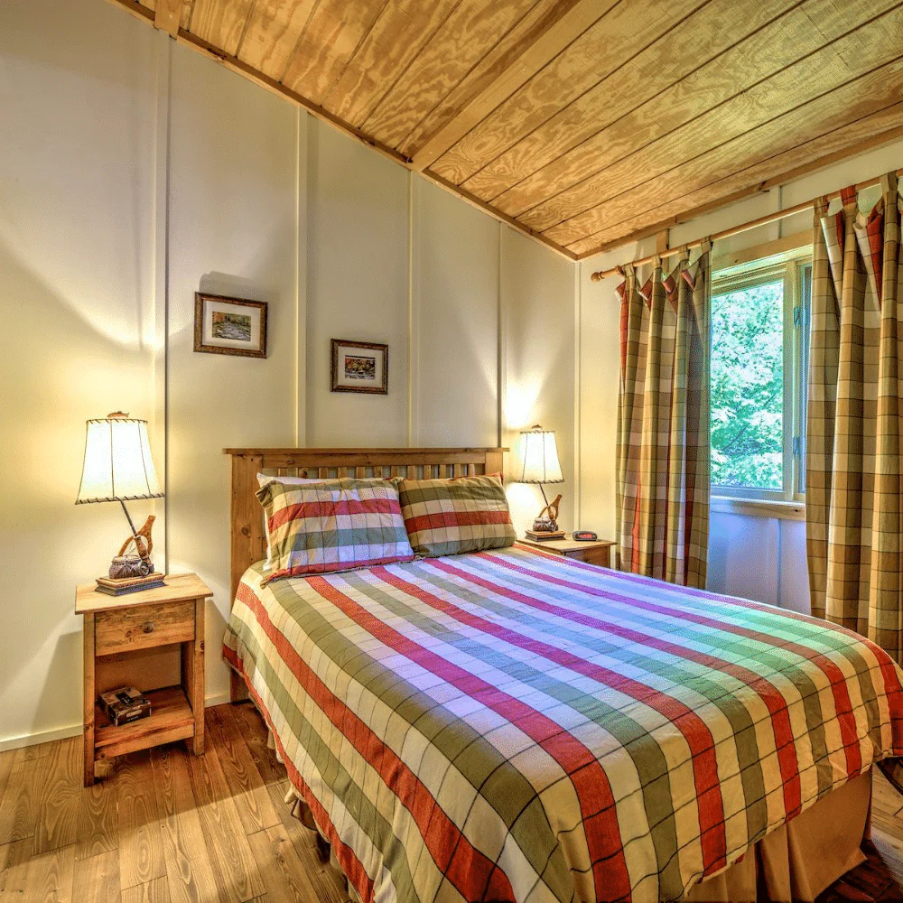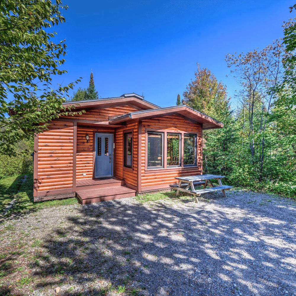 – Hébergement en chalet rustique situé dans la section boisé du domaine à quelques minutes à pied du lac et du Club house. Unité toute équipée avec deux chambres à coucher fermées (1 lit double et 2 lits simples) + un sofa-lit au salon, cuisine complète, combustion lente au salon, laveuse et sécheuse.