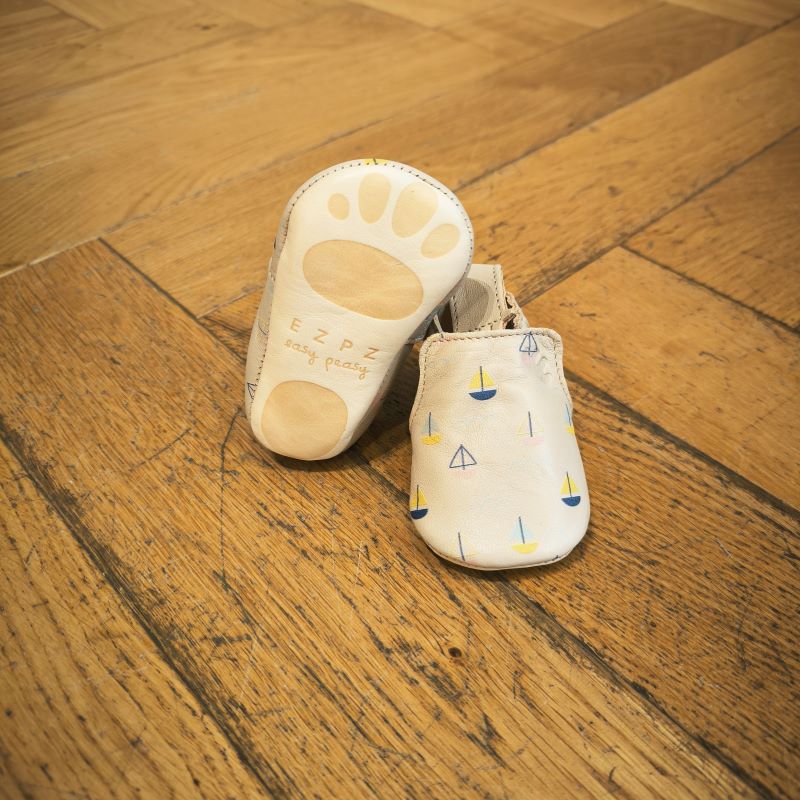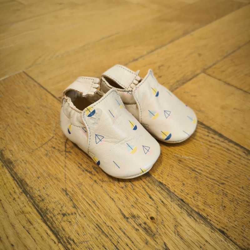 Chausson tout en cuir écologique tanné sans chrome. Chaussons souples et confortables. Motif petit bateau sur cuir beige Modéle mixte , peux chausser un peu petit . Idéal pieds « normaux » ou ronds (16/17 pour le 0/6 mois et 18/19 pour le 6/12 mois )