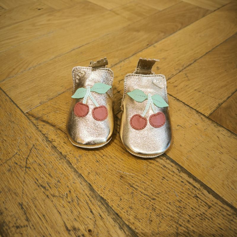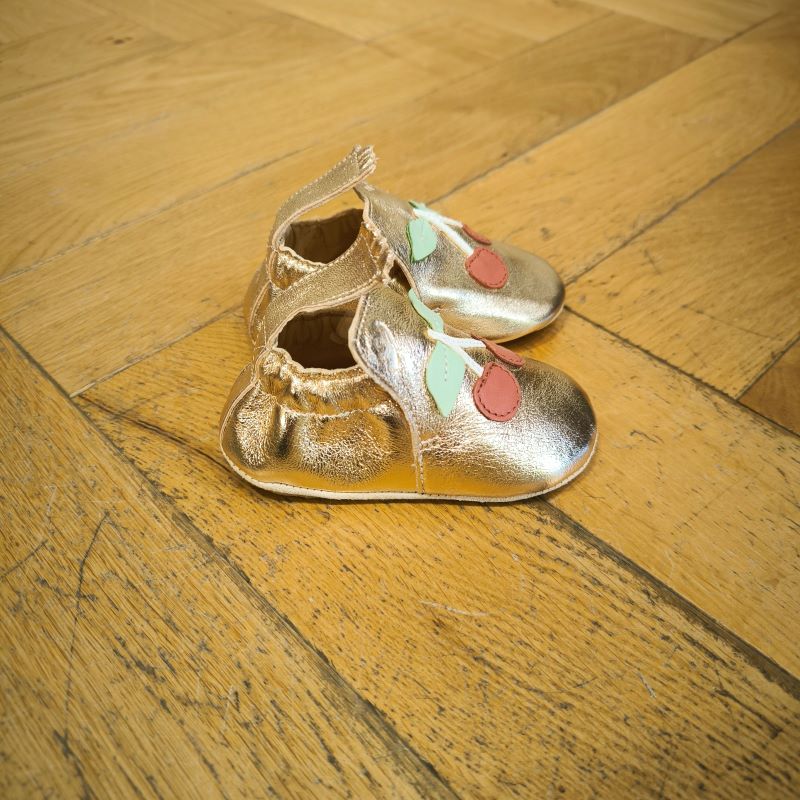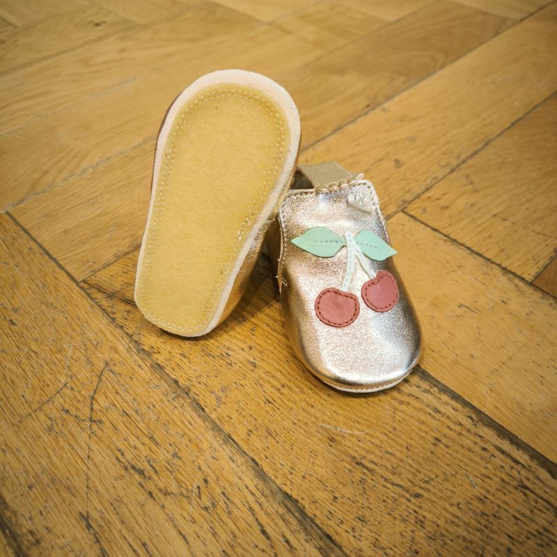 Chausson tout en cuir écologique tanné sans chrome. Chaussons souples et confortables. Motif cerise adorable sur un cuir irisé rosé Peux chausser un peu petit . Idéal pieds « normaux » ou ronds
