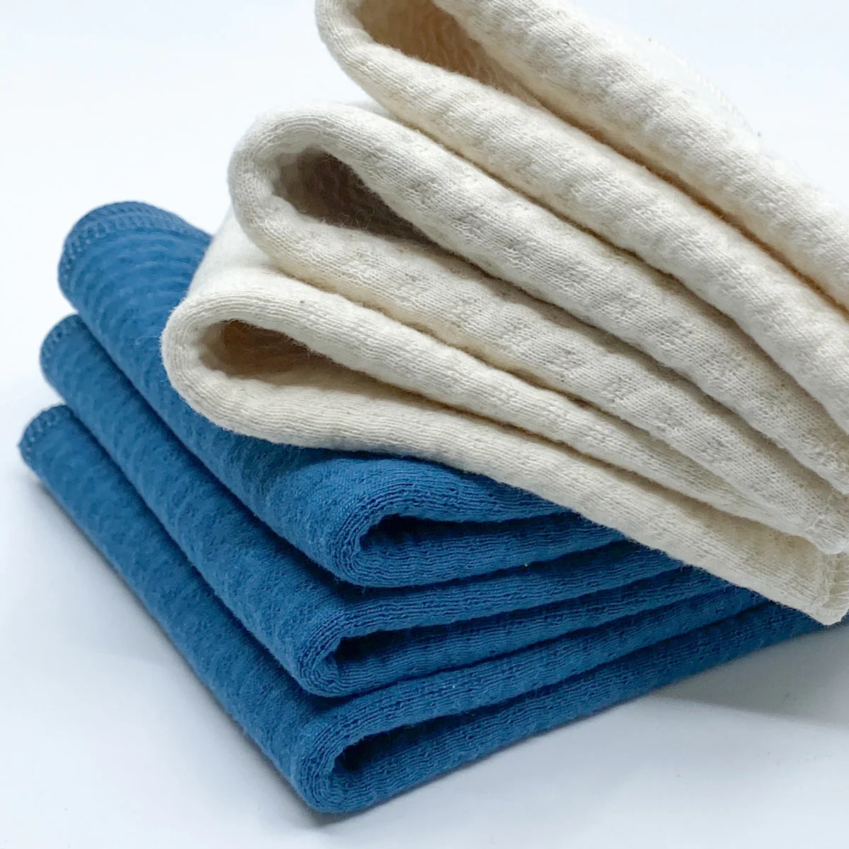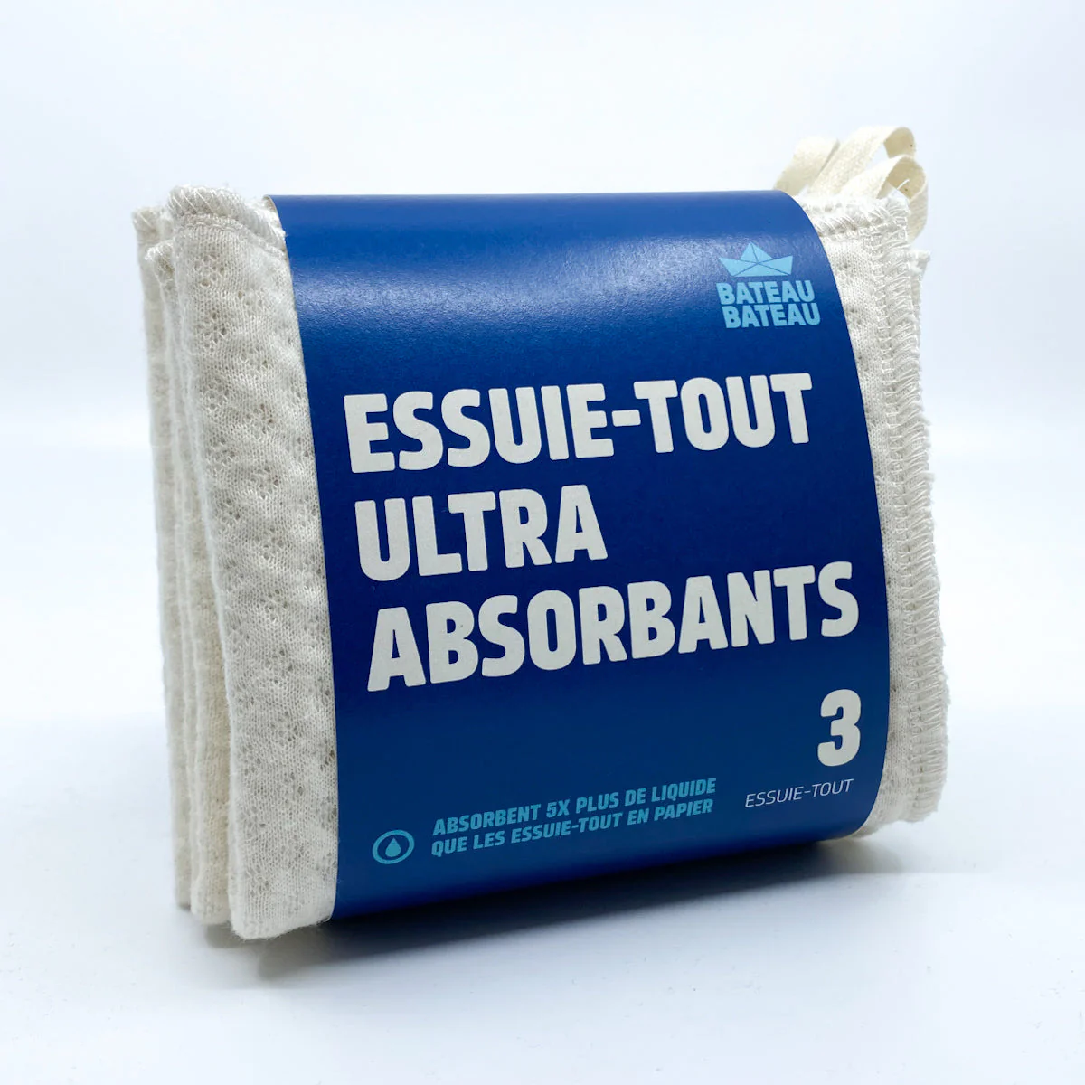 Nos essuie-tout ultra absorbants sont fait de tissu 100% coton biologique. Ils vont à la laveuse et à la sécheuse. En cas de tâches résistantes vous pouvez les faire tremper dans de l’eau chaude avec du percarbonate de soude.