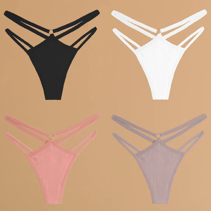 FINETOO 4 pièces sous-vêtements en coton à doubles ceintures fines pour femmes, string taille basse rayé, culottes unies, lingerie respirante