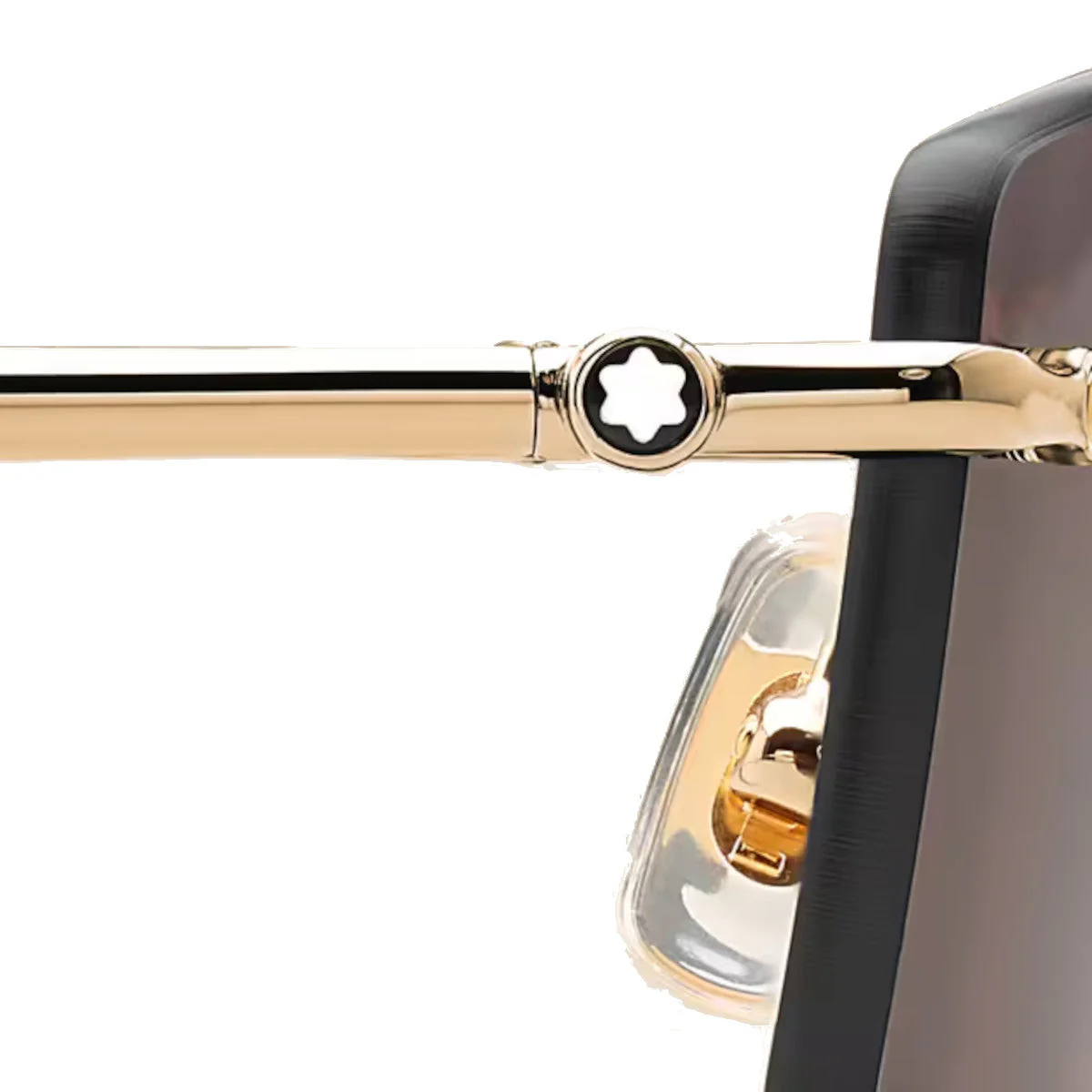 Ces lunettes de soleil non cerclées carrées possèdent une monture métallique dorée et des verres marrons. Inspirées des instruments d’écriture Meisterstück, les branches tubulaires sont enrichies de 3 anneaux fins. Le logo Montblanc est gravé au laser sur le verre gauche et un détail en émail noir est dissimulé sur les extrémités