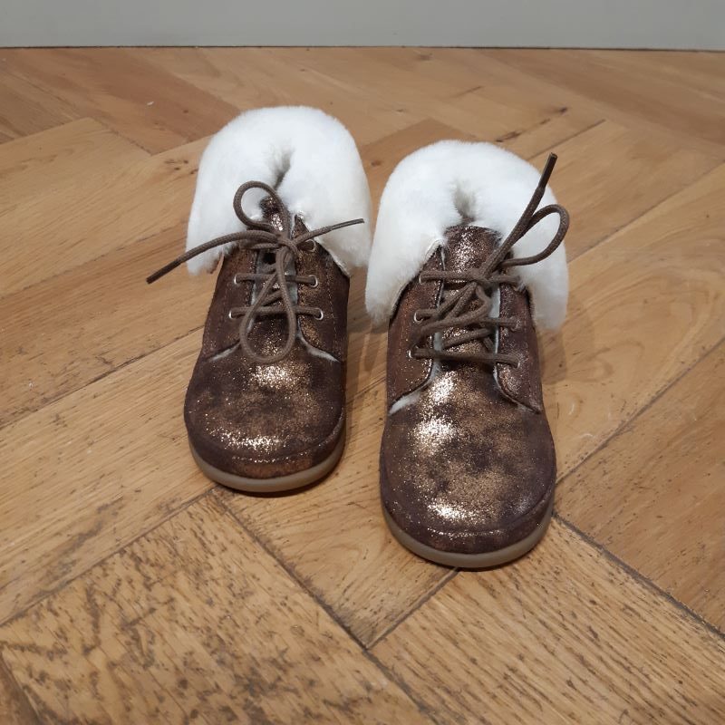 Superbe bottillon premier pas, en cuir fourré. Modéle confortable , chaud et chic . chausse normalement. Chaussant convenant aux pieds « normaux » à « fins »