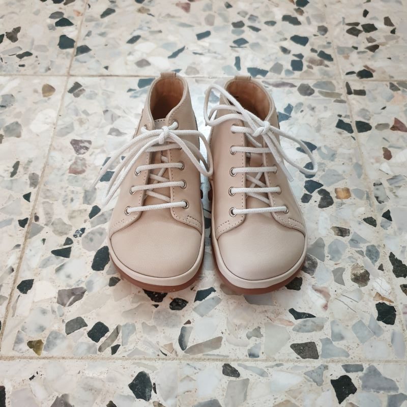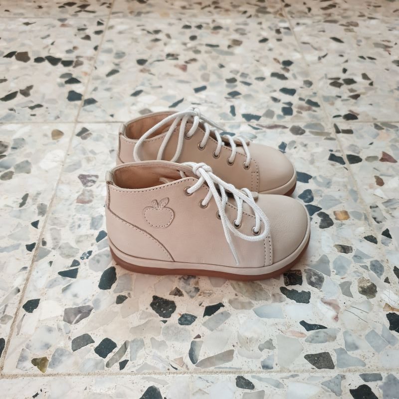 La Newflex Basic est un bottillon premiers-pas à lacets conçue pour les enfants, présentée ici en cuir craie et semelle miel