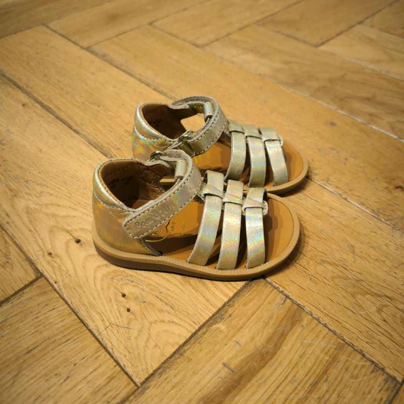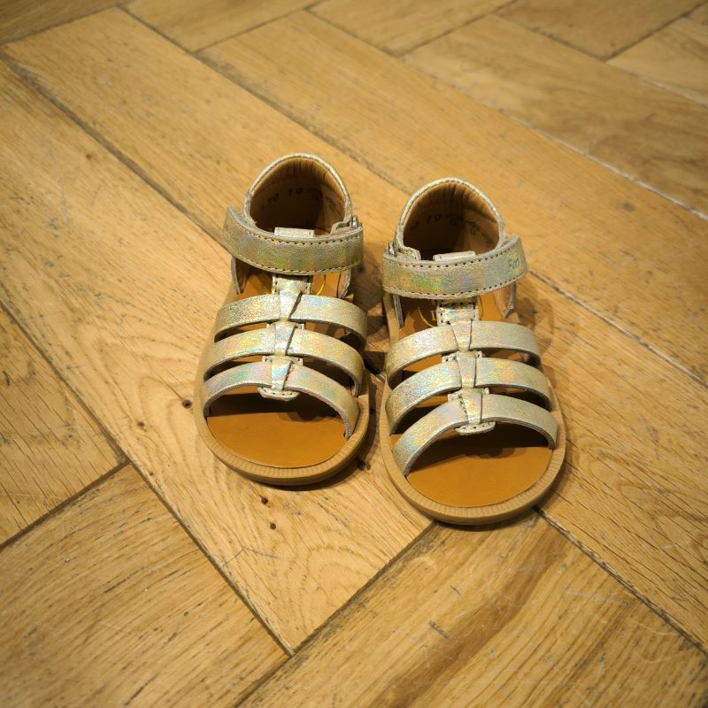 POPPY STRAP . modéle de sandale pour petites filles , devenu un classique de la marque . Facile à mettre, léger confortable et intemporel On adore ce coloris PLATINE franchement réussi et indémodable ! Chausse normalement . Convient aux pieds « normaux » et un peu ronds.