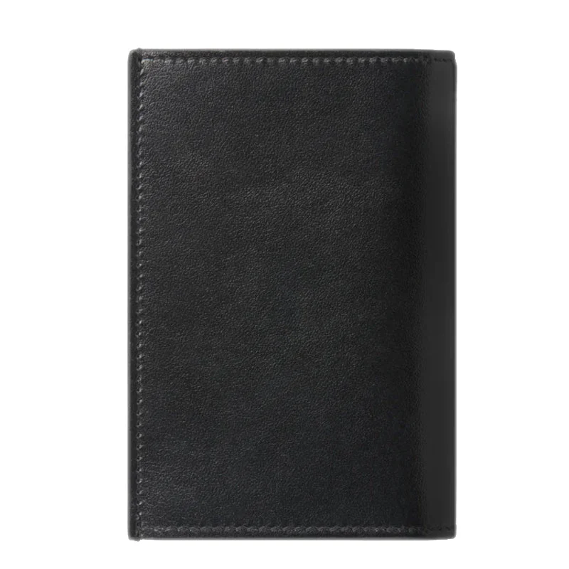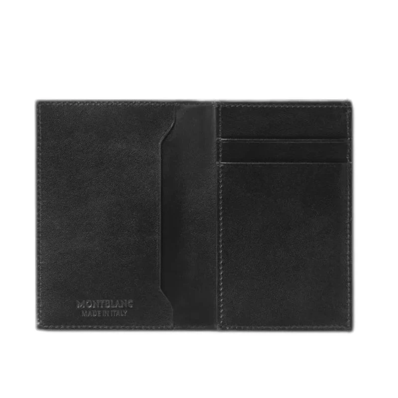 Conçu en cuir lisse noir, cet élégant porte-cartes de visite peut accueillir deux cartes de crédit dans des fentes dédiées et offre un compartiment spacieux pour les cartes de visite. Il est également doté de deux poches supplémentaires pour les billets pliés et reçus. Il est doublé de tissu noir et orné de l’emblème Montblanc.