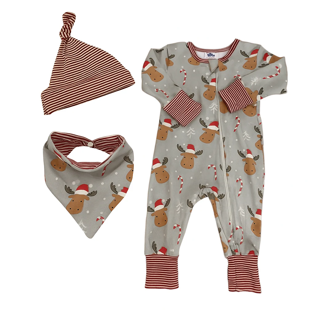Motifs mignons sur fond gris, les rennes sont taupes et rouges.