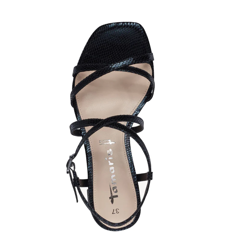 Les sandales à talon carré Tamaris allient féminité et modernité pour un style estival chic et tendance. De couleur noire, elles se distinguent par leur design raffiné avec des lanières fines effet croco vernies qui assurent un excellent maintien du pied. Leur fermeture à boucle réglable autour de la cheville permet un ajustement précis et sécurisé. Grâce à la technologie Touch-it, leur semelle intérieure à mémoire de forme garantit un confort optimal en absorbant efficacement les chocs. Leur talon carré de 5 cm, associé à une semelle fine et souple, assure une démarche stable et élégante. 100 % vegan, ces sandales sont conçues sans matériaux d’origine animale pour une mode responsable. Parfaites pour celles qui recherchent une sandale élégante, confortable et tendance.