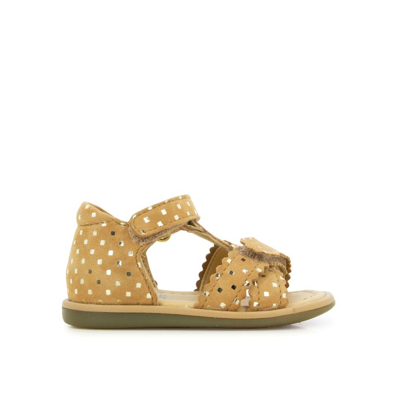 Sandale tout cuir camel et plumetis doré