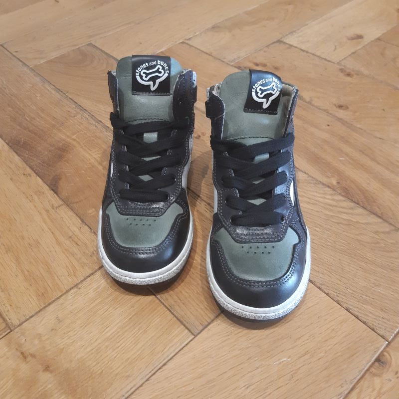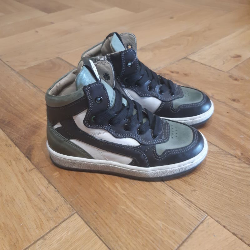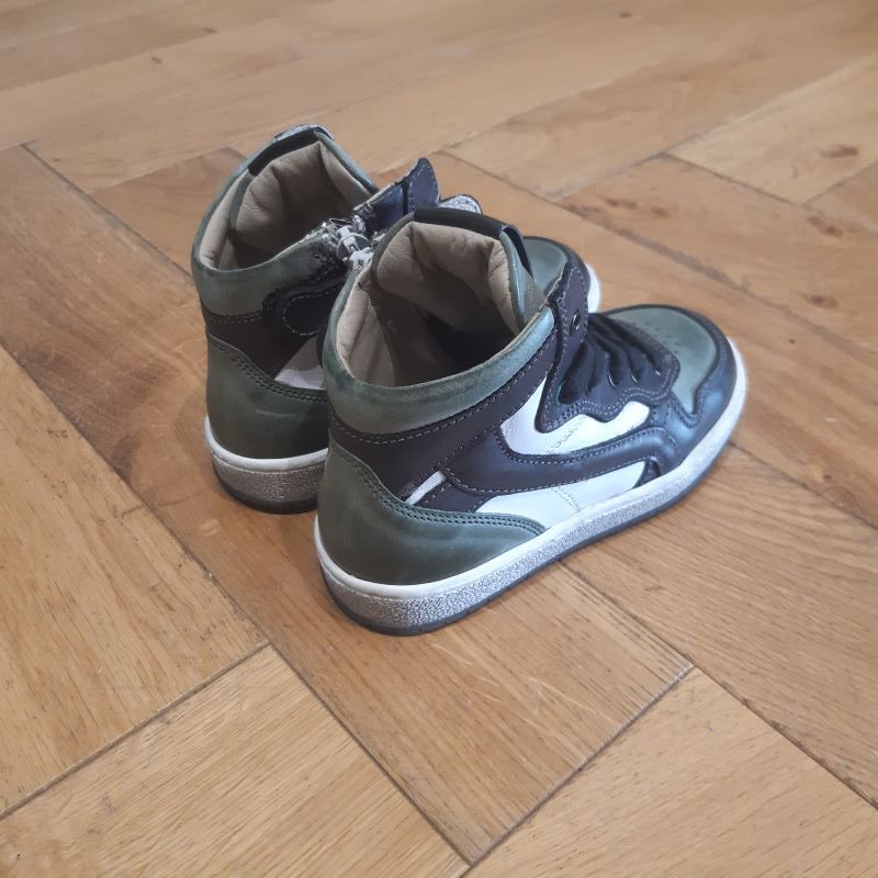 Modéle de chaussure montante , tige lacet avec zip intérieur pour un usage plus facile . Produit tout en cuir, monté sur une semelle légérement grisé. joli coloris noir, vert et blanc . modele qui saura coller a la tendance tout en étant une veritable chaussure pour enfant.