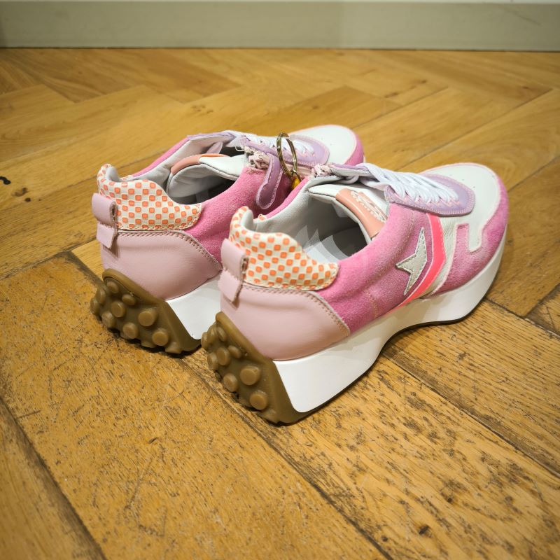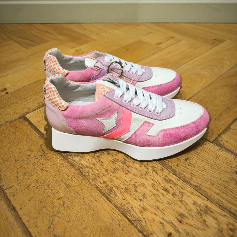 Modele de chaussure basse tout en cuir , monté sur semelle caoutchouc blanc et miel épaisse . Modéle a lacets avec un jolie semelle originale et des couleurs vibrantes.