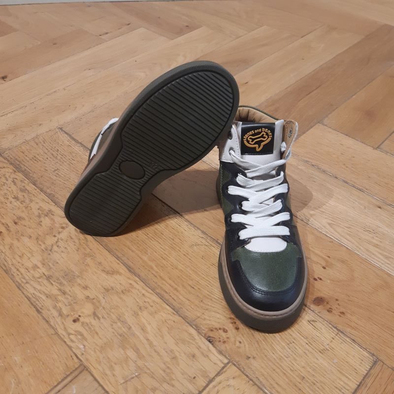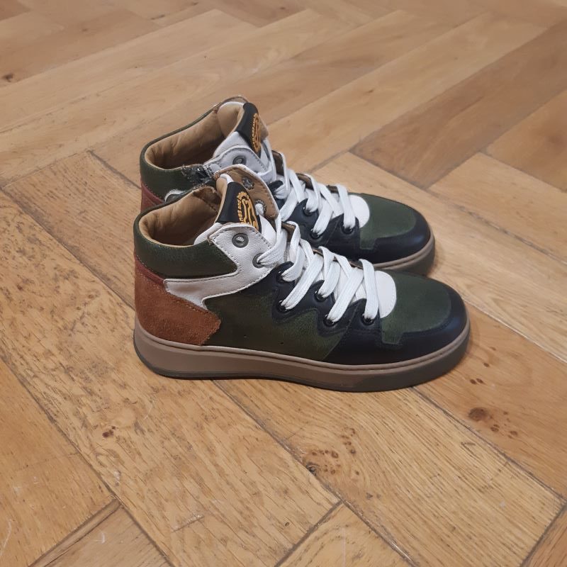 Modéle de chaussure montante , tige lacet avec zip intérieur pour un usage plus facile . Produit tout en cuir, monté sur une semelle légérement grisé. joli coloris noir, vert et blanc . modele qui saura coller a la tendance tout en étant une veritable chaussure pour enfant.
