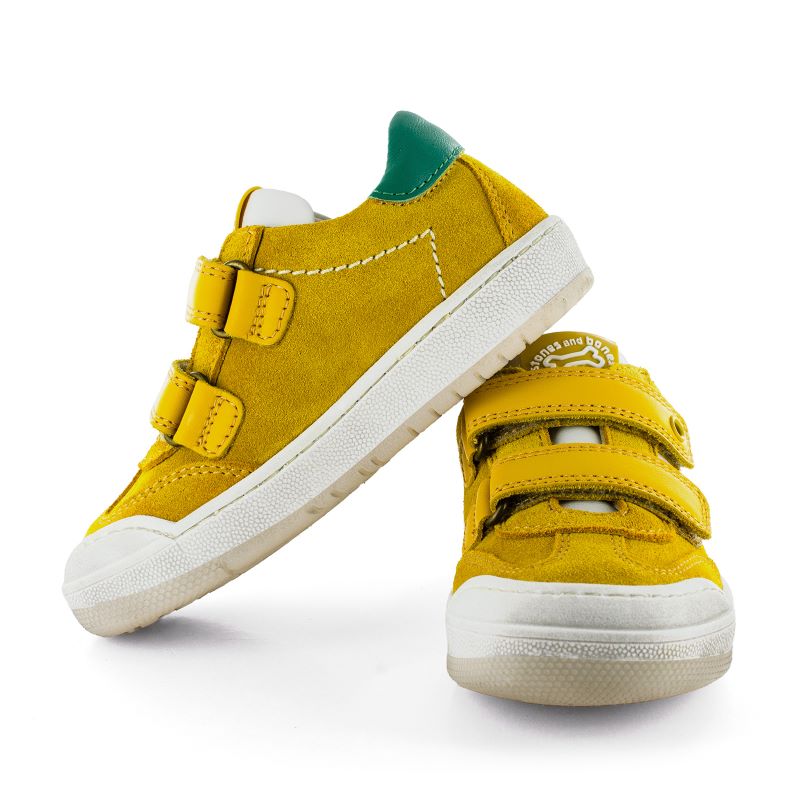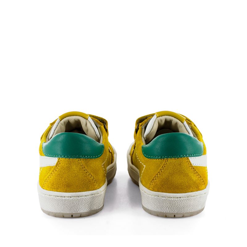 Modele de chaussure basse tout en cuir , monté sur semelle caoutchouc blanc et miel . Modéle a velcros, superbe couleur jaune acidulé et arriere vert foret